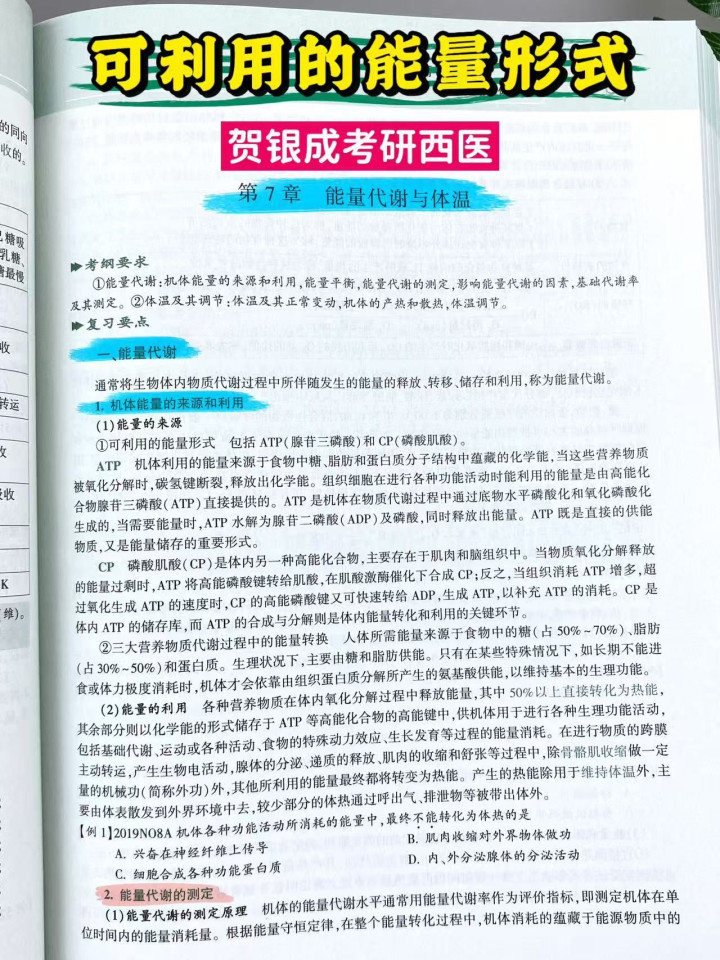 可利用的能量形式 包括ATP(腺苷三磷酸)和CP(磷酸肌酸)。ATP机体利用的能量来源于食物中糖、脂肪和蛋白质分子结构中蕴藏的化学能,当这些营养物质被氧化分解时,碳氢键断裂,释放出化学能。组织细胞在进行各种功能活动时能利用的能量是由高能化合物腺苷三磷酸(ATP)直接提供的。ATP是机体在物质代谢过程中通过底物水平磷酸化和氧化磷酸化生成的,当需要能量时,ATP水解为腺苷二磷酸(ADP)及磷酸,同时释放出能量。ATP既是直接的供能物质,又是能量储存的重要形式。CP磷酸肌酸(CP)是体内另一种高能化合物,主要存在于肌肉和脑组织中。当物质氧化分解释放的能量过剩时,ATP将高能磷酸键转给肌酸,在肌酸激酶催化下合成CP;反之,当组织消耗ATP增多,超过氧化生成 ATP的速度时,CP的高能磷酸键又可快速转给ADP,生成ATP,以补充ATP的消耗。CP是体内ATP的储存库,而ATP的合成与分解则是体内能量转化和利用的关键环节。